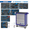 КомплектацияМодуль 1Набор торцевых головок 1/2" с принадлежностями, 37 предметов 9-4537MRVНабор торцевых головок 3/8" с принадлежностями, 44 предмета 9-3544MRVМодуль 2Набор торцевых головок 1/4" с принадлежностями, 65 предметов 9-2565MRVНабор торцевых насадок, бит и ударная отвертка, 43 предмета 9-4143FRVНабор рожковых ключей, 12 предметов 9-1112MRVМодуль 3Набор накидных ключей и TORX L-образных, 19 предметов 9-90119MRVНабор комбинированных ключей, 20 предметов 9-1220MRVМодуль 4Набор напильников, торцевых отверток, съемники клипс и металлическая щетка, 13 предметов 9-90413TQVМодуль 5Набор разрезных ключей и шестигранники Г-образные, 15 предметов 9-90135MRVНабор пассатижей и бокорезов, 4 предмета 9-40104GPVНабор пассатижи, переставные клещи и зажим, 3 предмета 9-40113GPVНабор съемников стопорных колец, 4 предмета 9-44214GPVМодуль 6Набор отверток, 24 предмета 9-31124MRVМодуль 7Набор шестигранников L-тип, 8 предметов 9-22108MRVНабор зубил, выколоток, кернеров с молотком, 8 предметов 9-90118PRVВспомогательный инструментСъемник подшипников 2-х захватный 100 мм 7962-04Съемник подшипников 3-х захватный 100 мм 7963-04Магнит на гибком стержне 5х565 мм 2121-18Отвертка крестовая Phillips №2, 300 мм 14210212Отвертка шлицевая Slotted 6,5 мм, 300 мм 14226512Тестер для проверки напряжения, 3-48 В 9DC23Тележка инструментальная7 выдвижных полок, цвет синий Количество предметов: 325Количество ложементов: 15Размеры тележки в сборе: 460 х 680 х 955 ммУпаковка: картонВес: 88,35 кг
